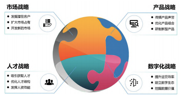 数字化转型为企业构建的新能力与新价值,必将对企业的发展战略起到引领作用。企业应深刻理解数字化转型与企业战略之间的互相促进、互相引领的关系,要将数字化转型作为企业战略的重要组成,明确企业数字化转型的愿景、使命、定位、目标、战略举措等。数字化转型的唯一核心即服务于企业战略目标,其与企业市场战略、产品战略、人才战略等其他发展战略共同规划和选择企业前进方向,促进企业业务高效和可持续发展。