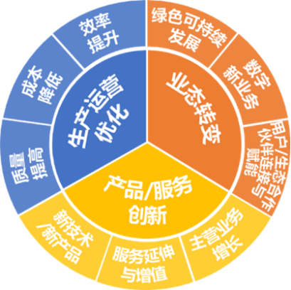 价值效益分类体系给出数字化转型可实现的价值效益参考分类,从生产运营优化、产品/服务创新、业态转变等方面,明确数字化转型过程中不断跃升的价值效益。