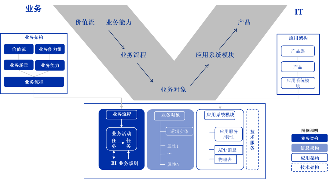 IT产品与项目应适当解耦。IT产品化运作,需要企业改变作战队形,改变之前需求交接式的IT开发方式,将IT融入业务,共同组建业务和IT一体化产品团队,并实现“业务、数据、IT”联合组队,做到“业务人员懂IT,IT人员懂业务”,实现产品团队一盘棋运作。数字化转型要求IT产品团队能更敏捷地响应业务,改变之前的“烟囱式”IT交付方式,由“做功能”变为“做服务”。这就需要IT产品团队改变设计方法,用服务化V模型(图5-10)指导团队的一体化设计,让业务、数据、IT有机融合在一起。▲图5-10 服务化V模型