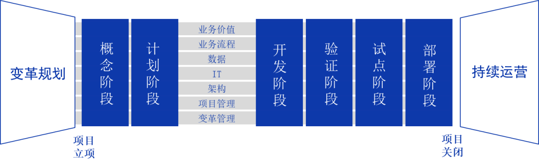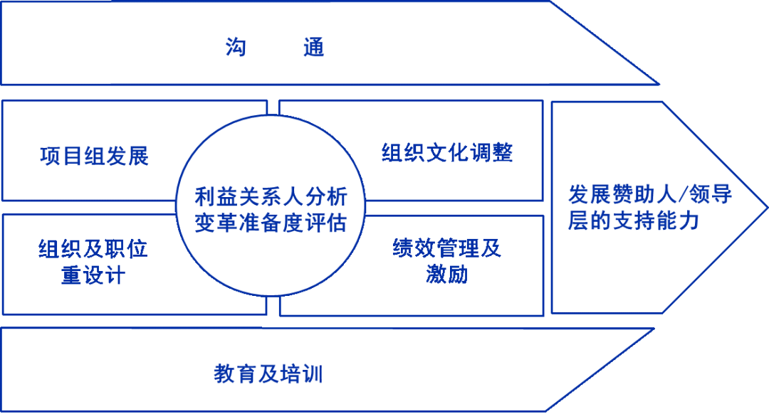 “七横八纵”(图4-8)完整地展示了变革项目实施的各个阶段(纵向),以及贯穿变革始终的关键要素如何被以项目的形式有效地组织并管理(横向)。